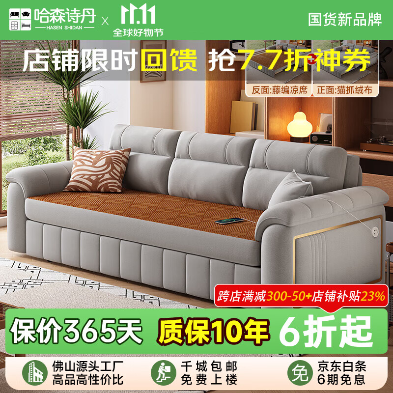 哈森诗丹广东佛山原创新款带凉席沙发床一体两用小户型客厅高端沙发折叠床 外径:1.4m(无储物)S+级猫抓绒 高弹海绵款(软硬适中)