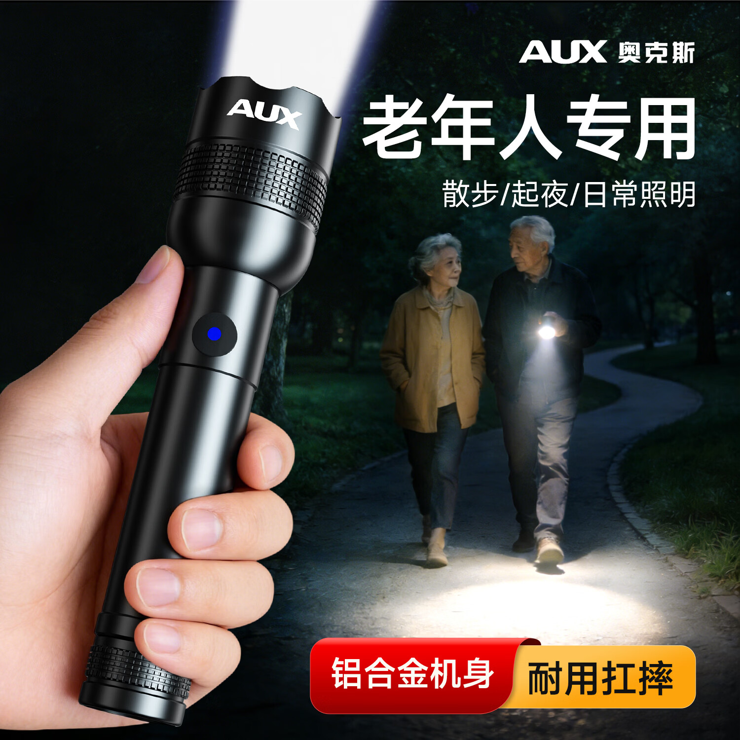 奥克斯(AUX)强光手电筒老年人专用充电式耐用抗摔家用老人起夜超亮小型应急灯 【老年人手电】铝合金机身耐用抗摔-2200毫安
