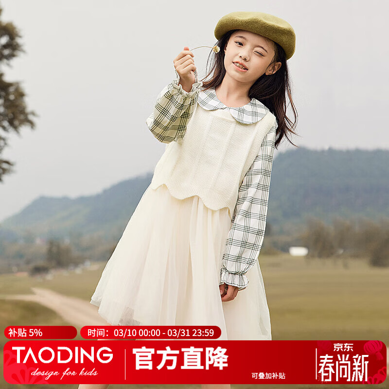 淘町女童连衣裙韩版洋气中大童网纱裙中长款秋新款儿童蓬蓬裙潮英伦风 咖格 拼接纱裙 /P2121006 110 110cm