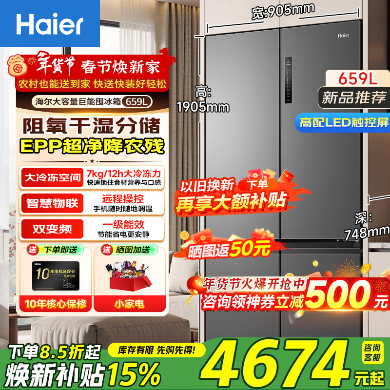 海尔(Haier)冰箱659升十字对开四门一级能效双变频风冷无霜除味保鲜超大容量600L以上智能电冰箱 家电国家补贴 灰色丨EPP超净降农残+母婴三档变温+阻氧干湿分储