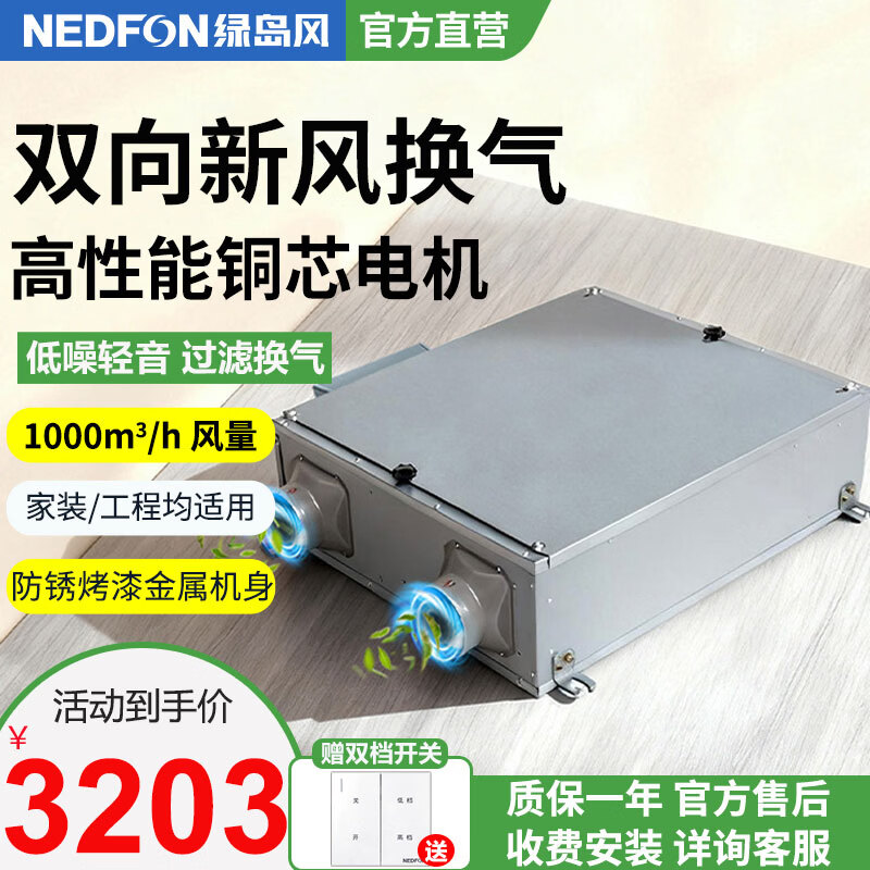 绿岛风(Nedfon)双向流新风机全屋家用通风换气新风系统大风量家用吊顶新风机管道双向换气机【双档开关款】 吊顶式 1000m³/h 120㎡以上