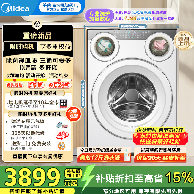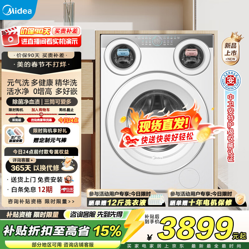 美的(Midea)可爱多滚筒全自动洗衣机分区洗三筒一体机 11kg多筒母婴儿洗智能投放变频 除菌除螨羊毛绿标三桶 MG11GGEX 滚筒