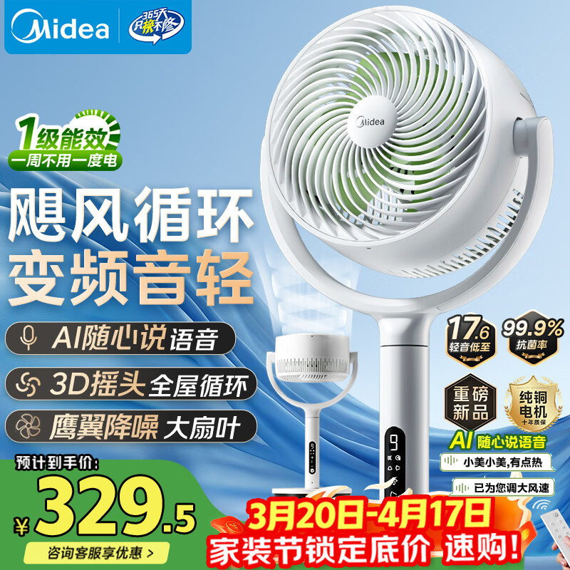 美的(Midea)【3D摇头】直流变频轻音落地空气循环扇家用卧室净化换气扇语音遥控电风扇大风力一级能效GDJ24WYJ