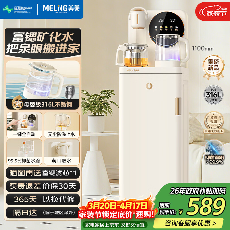 美菱富锶矿化防溢茶吧机家用多功能办公室立式下置水桶饮水机茶吧柜316L不锈钢烧水壶鲜活水1.0 N08Pro