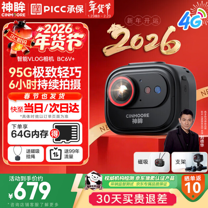 神眸运动相机口袋摄像头4g终身免流量便携监控六轴防抖随身高清电池记录仪户外骑行vlog直播BC6V+