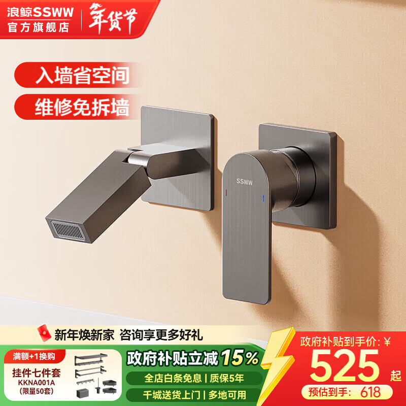 浪鲸(SSWW)卫浴入墙暗装龙头冷热双控出水精铜隐藏预埋嵌入式卫生间浴室龙头 【枪灰】002A暗装机械龙头
