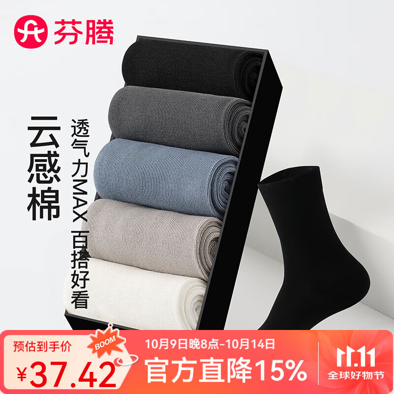 芬腾男袜【新疆棉】5双装纯色袜男士袜子透气亲肤中筒袜运动通勤商务 白色/深灰/黑色/灰蓝/卡其 5双 均码