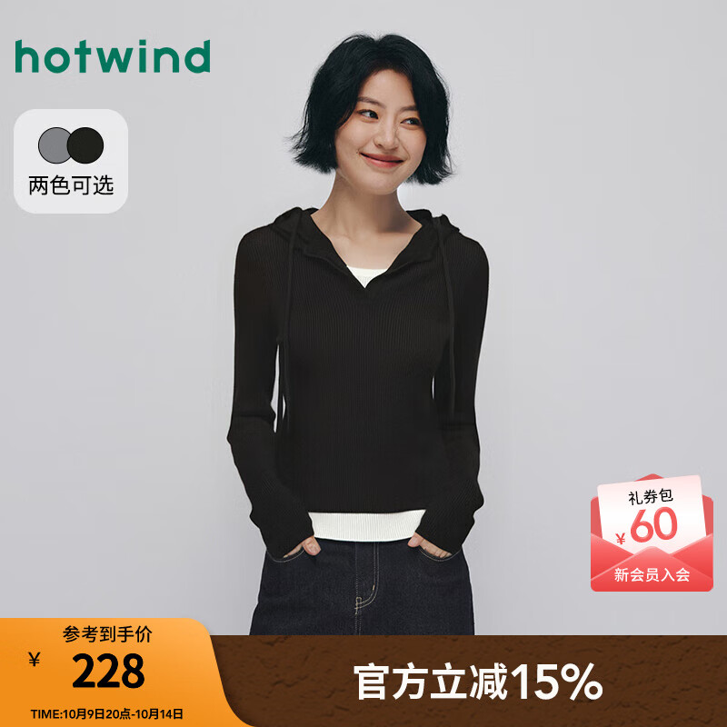 热风【商场同款】女士连帽针织衫上衣2025年秋新款假两件针织韩系修身 01黑色 XL