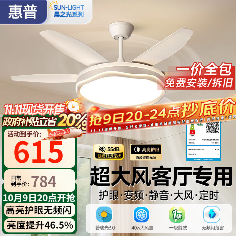 惠普餐厅吊扇风扇卧室大风力电扇灯客厅家用一体吊灯隐形风扇灯具 6片大扇叶-52寸静音大风力