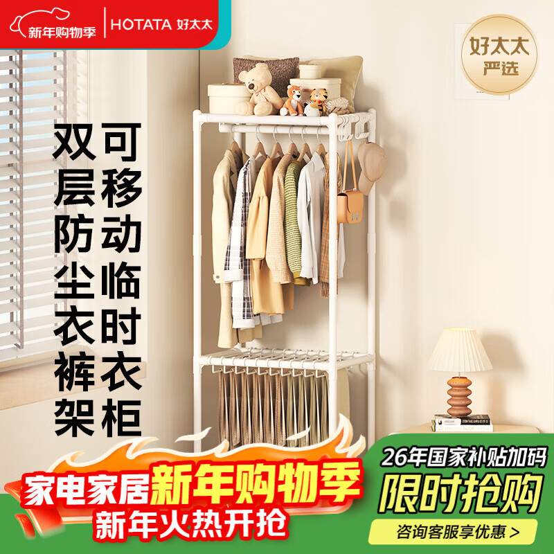 好太太(Hotata)落地晾衣架可移动室内家用多功能双层挂衣架卧室大容量收纳衣帽架 【白色】双层挂衣架/送挂钩+送裤架