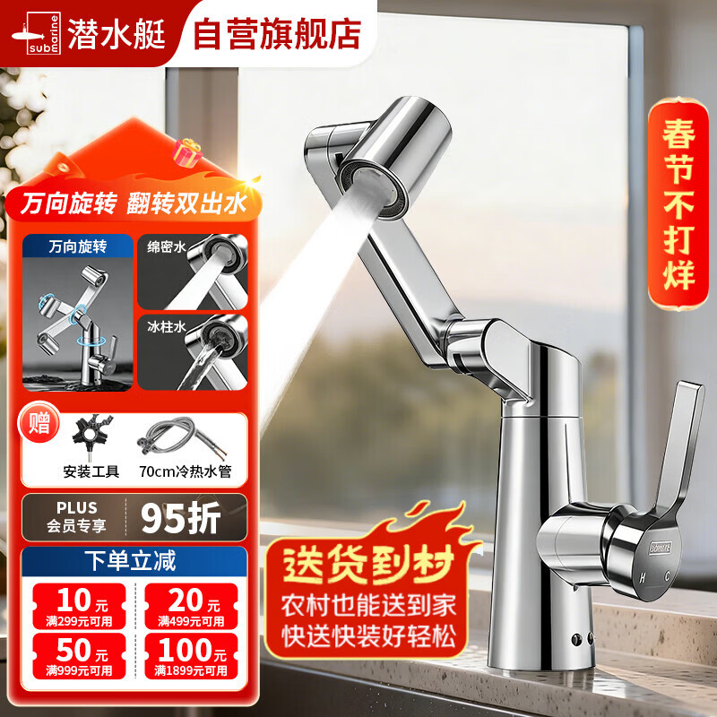 潜水艇面盆水龙头机械臂万向冷热水器二合一洗手盆脸卫生间不锈钢L7112