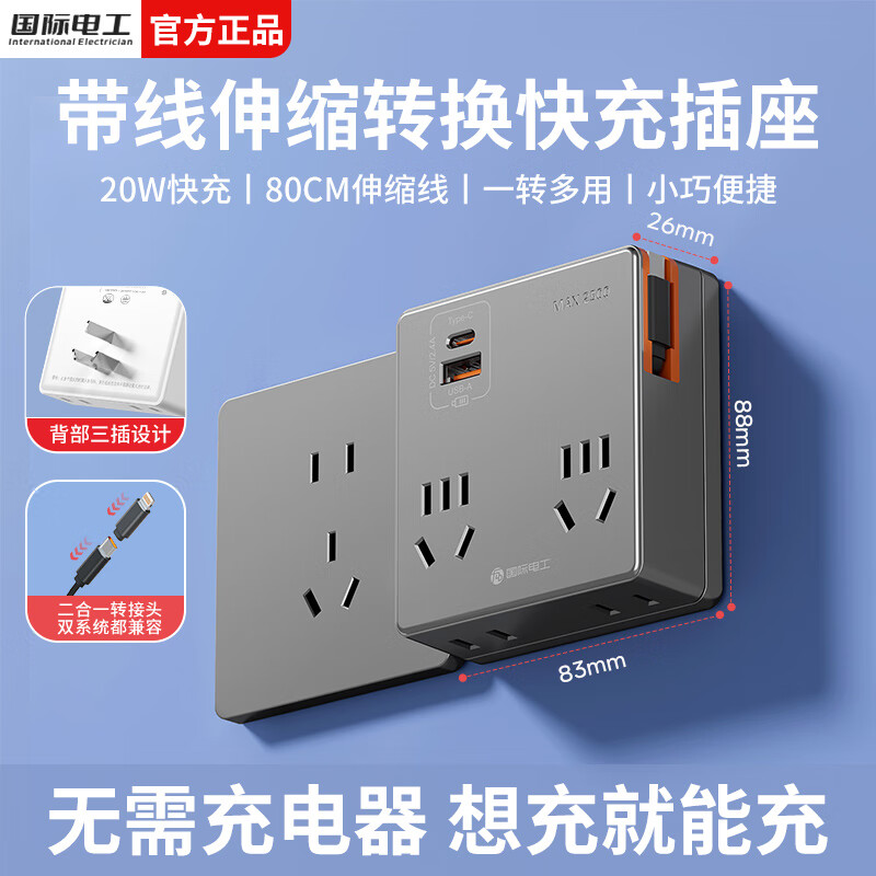 国际电工86型带线伸缩插座转换器直插拓展插头20W快充多功能USB电源插板 一转四(A+C口)带C伸缩线丨灰色