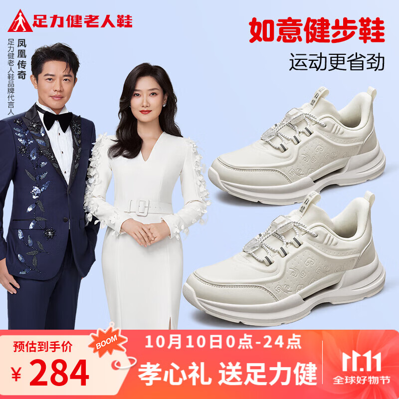 足力健中老年秋季锻炼健步鞋撑足弓软弹缓震舒适运动鞋送长辈 米白-女款 36