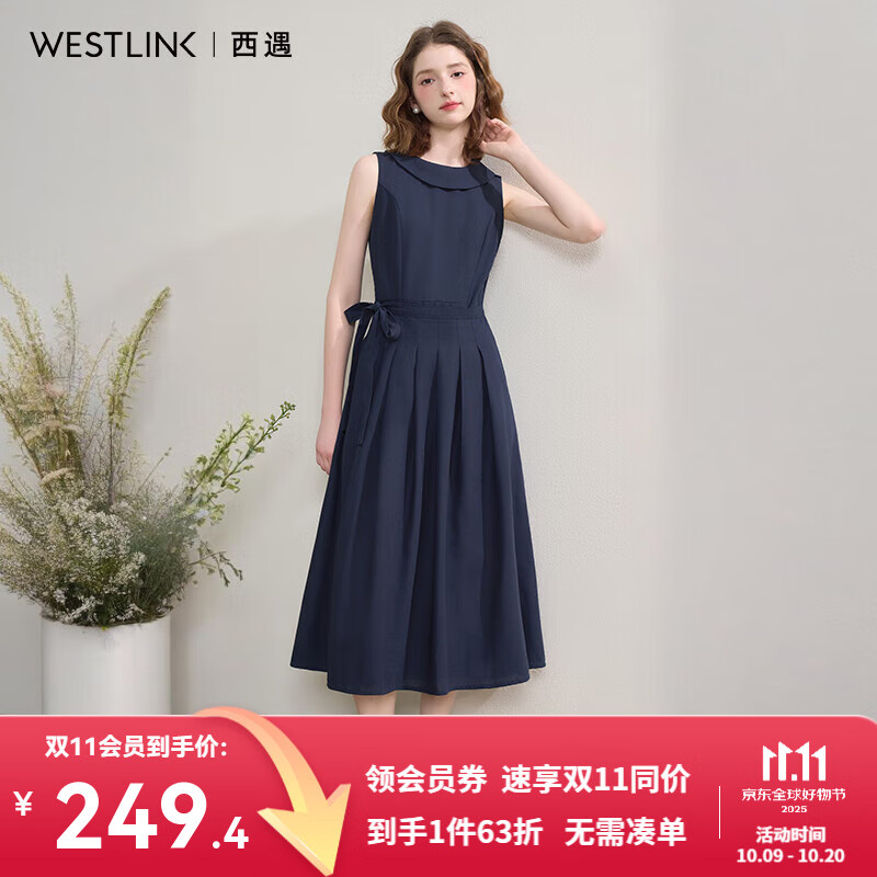 西遇设计感系带娃娃领无袖背心裙女2025秋季高腰显瘦连衣裙 蓝色 L (165)