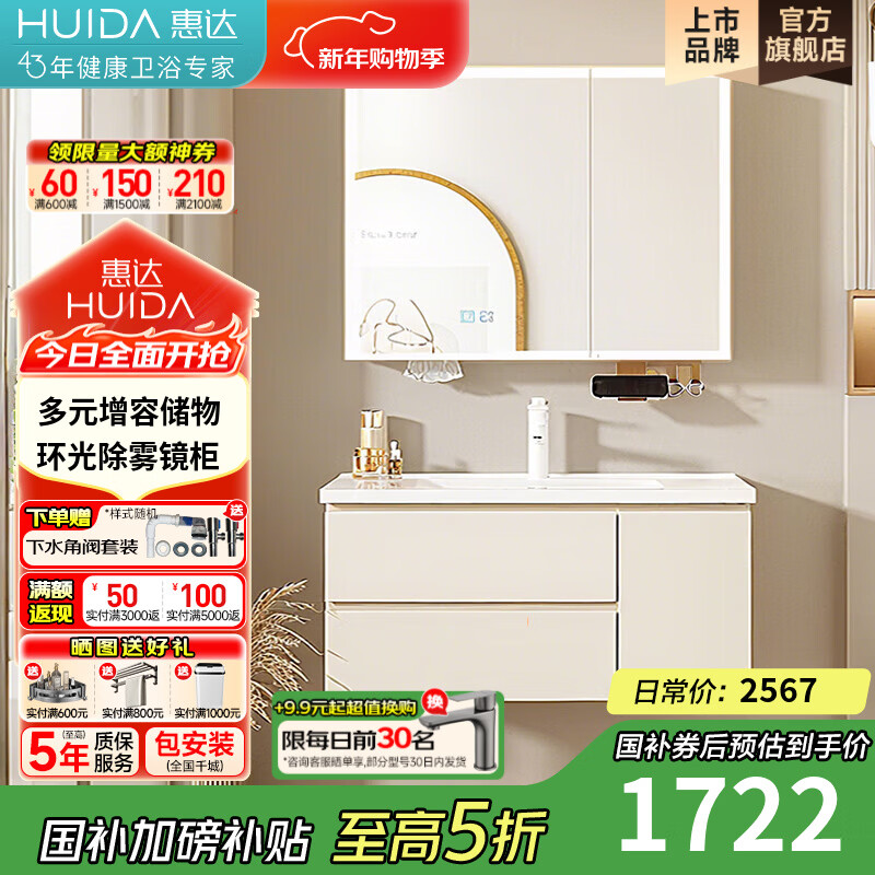 惠达(HUIDA)智能浴室柜陶瓷一体盆卫生间洗脸盆柜组合T99 90cm