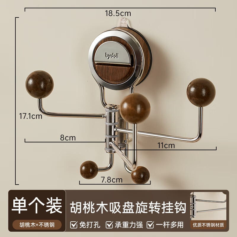 妃驰高颜值浴室吸盘旋转挂钩卫生间门后厨房免打孔真空无痕毛巾衣服钩 胡桃木色-吸盘挂钩【可旋转】