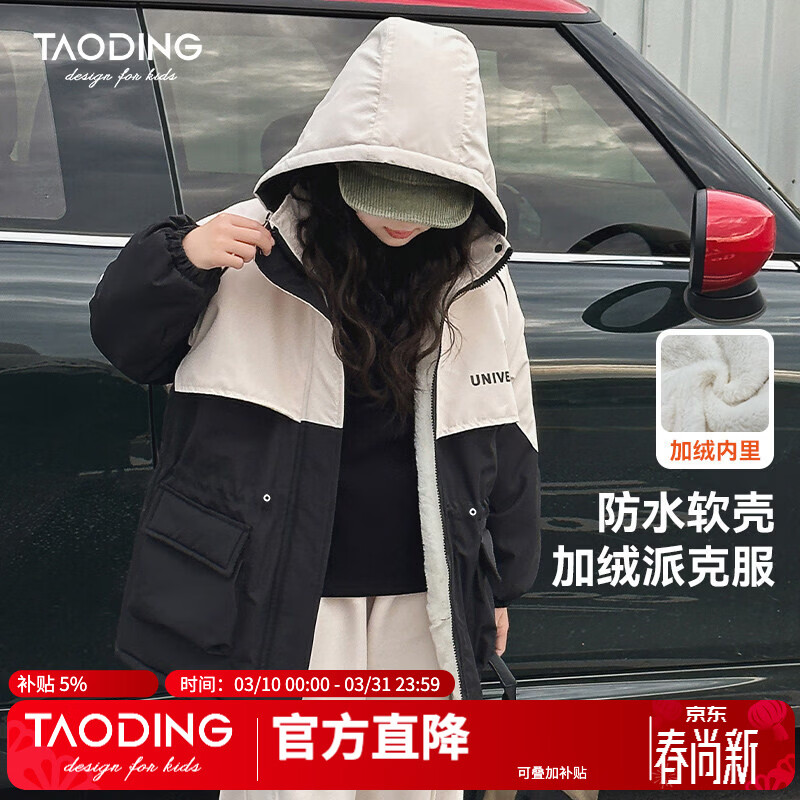 淘町女童加绒外套秋冬新款洋气女孩加厚保暖派克服大童工装冲锋衣 黑色 内里加绒保暖 130 47-60斤