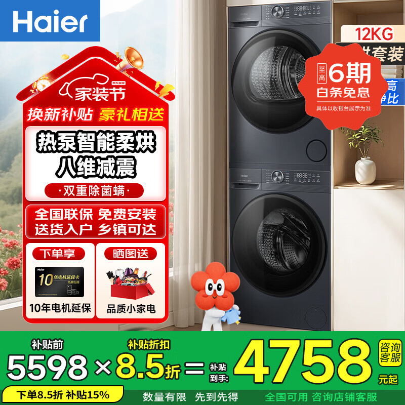 海尔(Haier)【2026旗舰新品小红花系列】12公斤超薄大容量八维减震洗烘套装12KG滚筒洗衣机+12KG热泵烘干机组合洗烘一体 双重除菌+慕斯冲浪洗+热泵智柔烘干洗烘套装12kg