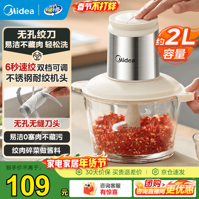 美的(Midea)绞肉机家用 多功能电动碎肉机 小型家庭搅馅机切肉机 料理机搅拌机搅打机 打蒜器婴儿辅食机 【单刀双档+无孔易洁】 2L JC23F