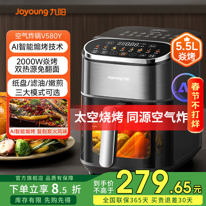 九阳空气炸锅家用可视大视窗免翻面 长条锅可烤整鸡AI烹饪 多功能 5.5L大容量蒸烤一体机 KL55-V580Y 【AI炙烤】炎烤免翻 5.5L