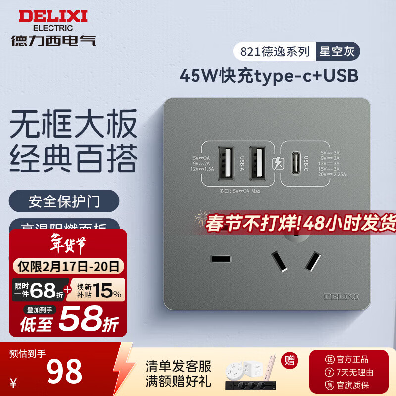 德力西(DELIXI)开关插座面板 86型CD821 无边框美学大板 星空灰电源插座墙壁面板 45W快充type-c+USB