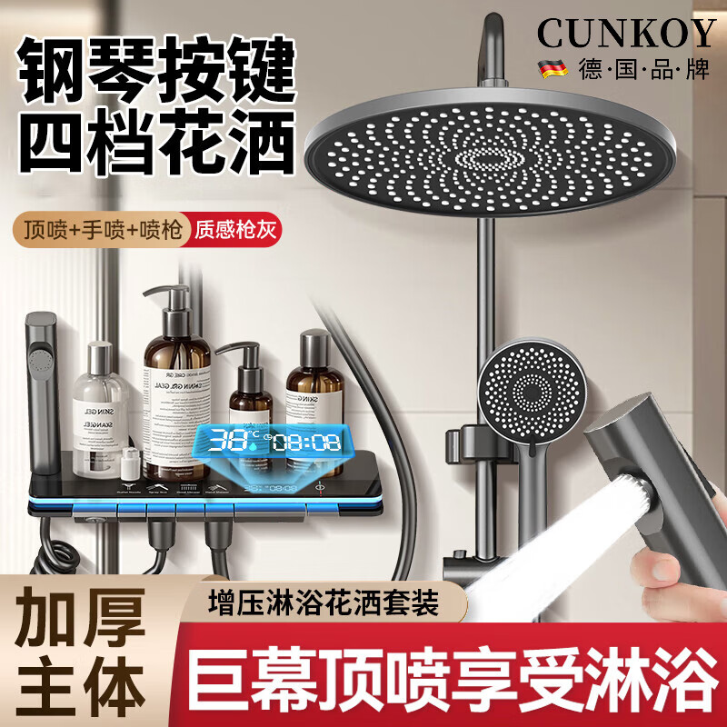 CUNKOY【德国】花洒淋浴套装智能恒温花洒全套一体式浴室卫浴洗澡一整套 钢琴键-四档圆形花洒套装 恒温调节丨智能数显丨四档琴键
