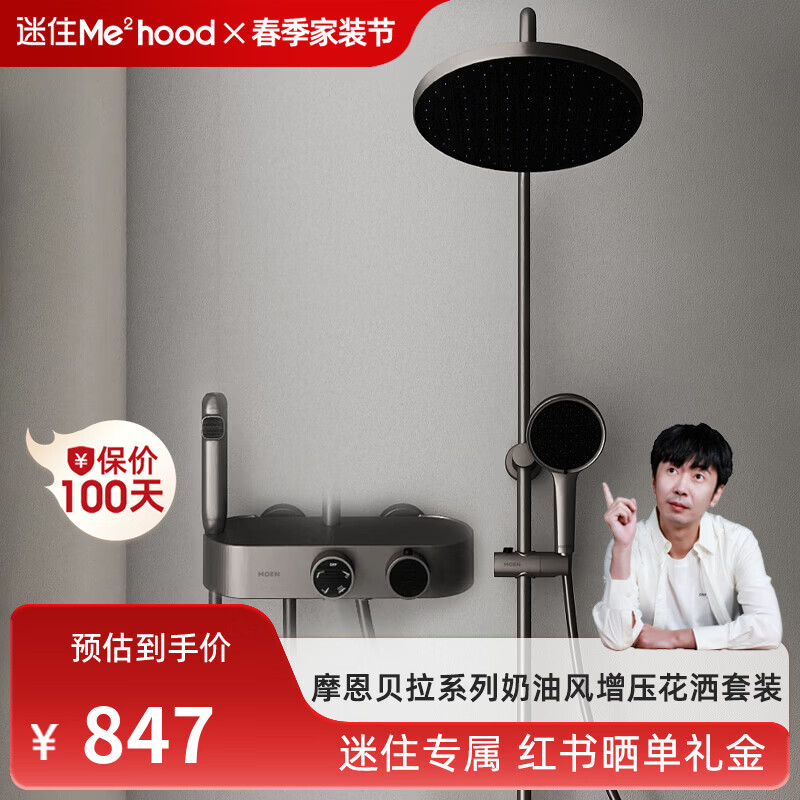 摩恩(MOEN)【迷住专属】贝拉系列花洒套装奶油风空气增压大平台置物淋浴器 冷热枪灰下出水+手持+顶喷+喷枪