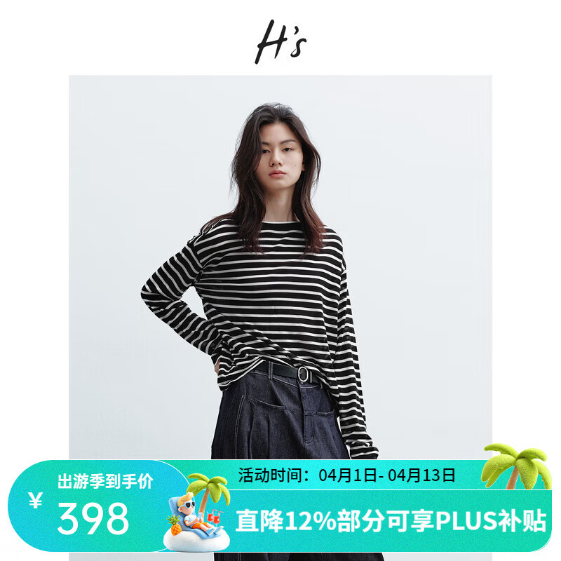 H's【莱赛尔】撞色条纹针织衫女26年春季新款落肩廓形内搭打底衫 黑白条纹 L