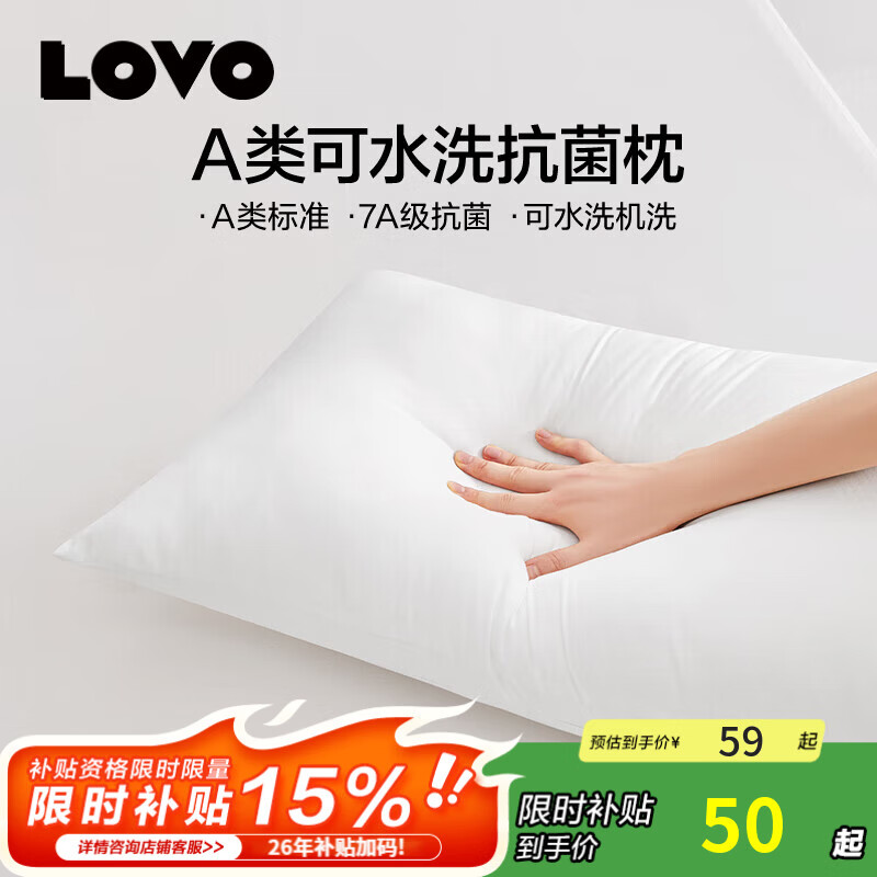 LOVO罗莱生活 五星级酒店A类标准抗菌可水洗机洗高弹蓬松枕头芯舒适枕 【A类抗菌+可水洗对枕】2只装 47cm *73cm