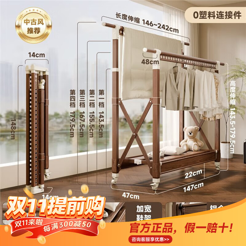 名至中古风晾衣架可折叠可升降卧室衣架落地立式室外防风落地晾衣架 中古风推荐1.46-2.4m 胡桃白