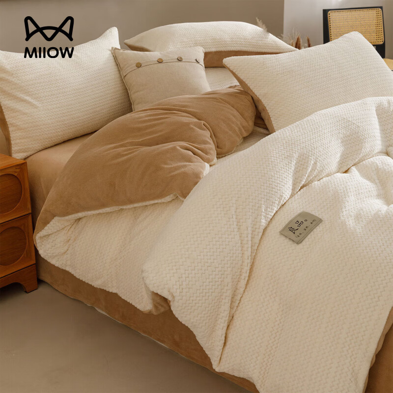 猫人(MiiOW)轻奢牛奶绒床上四件套2025新款秋冬季加厚珊瑚绒被套罩床笠三件套 米驼【高克重提花牛奶绒 蓄热保暖】 床笠款 1.8m床四件套-适合200x230cm被子