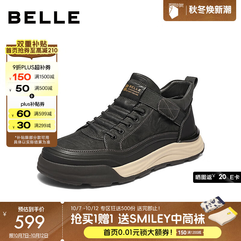 百丽(Belle)男鞋高帮休闲板鞋2025冬季新款商场款厚底套脚工装鞋加绒8WQ01DD5 黑色(单里) 41 (255mm)