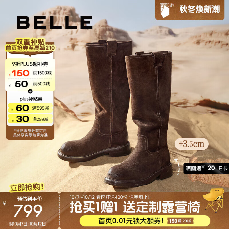 百丽(Belle)复古绒面堆堆靴西部靴女25冬新商场款厚底增高高筒靴E6G1DDG5预售 啡色 39