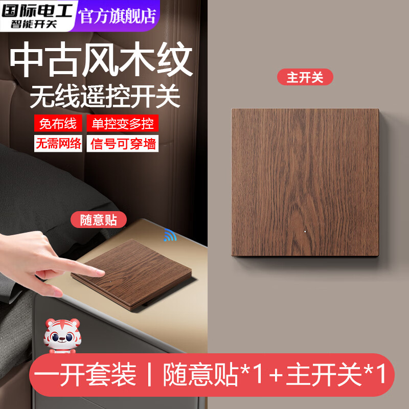 国际电工(FDD)仿木纹无线遥控开关远程控制器免布线智能子母开关面板双控随意贴 中古风木纹【一开主开关+一开随意贴】