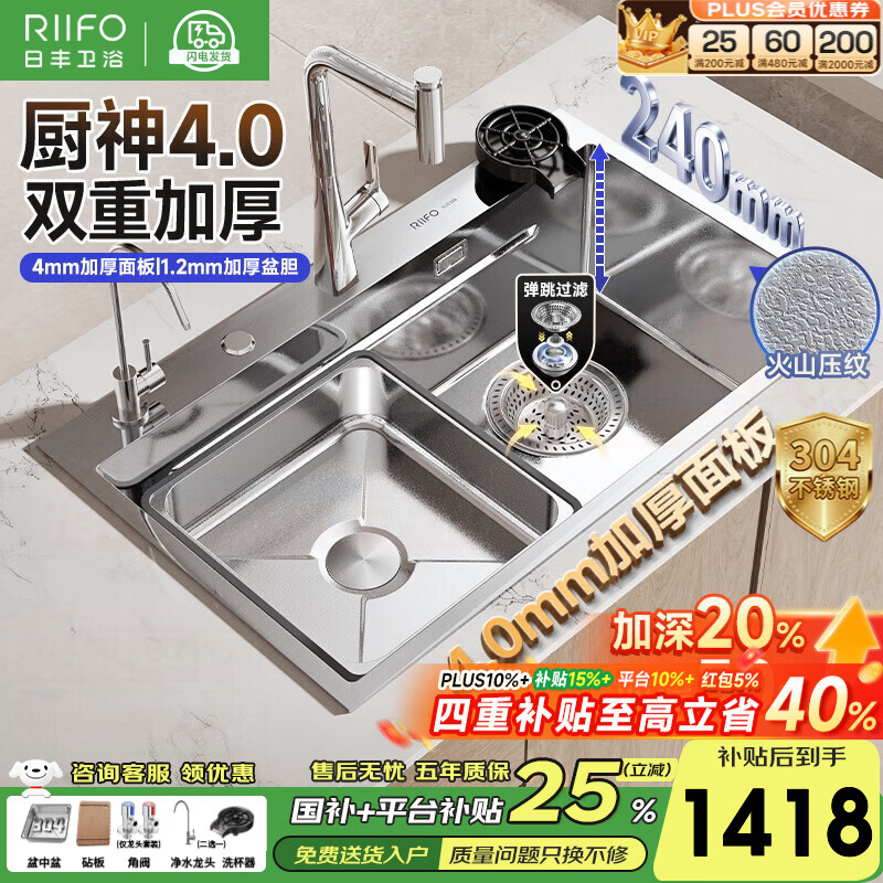 日丰厨神火山压纹纳米水槽大单槽洗菜盆厨房水槽家用加厚304不锈钢 「双重加厚|弹跳过滤」76x46|亮银冰柱水|送304盆中盆