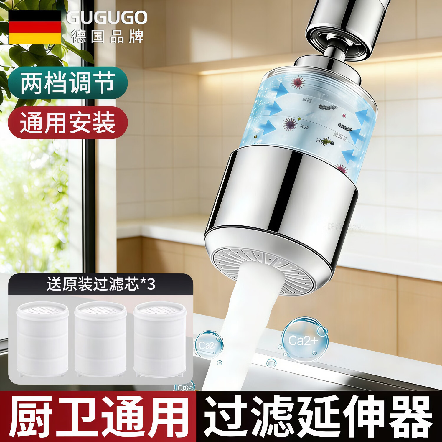 GuGuGo【德国】水龙头过滤延伸器防溅头起泡厨房面盆龙头万向旋转净水器 雅银【专业过滤】水龙头过滤器 高效过滤丨改善水质丨两档调节
