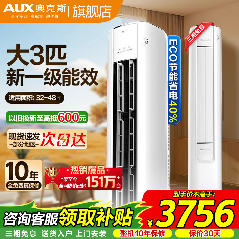 奥克斯(AUX)大3匹新一级立柜式空调大2匹三级变频冷暖 省电自清洁除菌圆柜空调客厅柜机 以旧换新 冷暖 大3匹 一级能效【ECO省电40%】32-48㎡