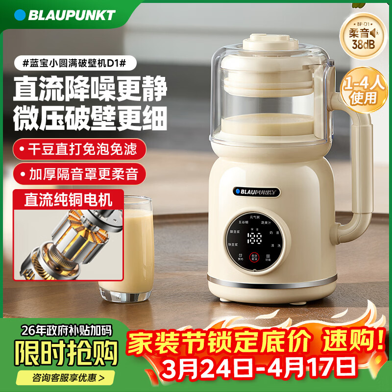 蓝宝(BLAUPUNKT)【抖音同款】豆浆机小型破壁机1-2人家用直流全自动免煮3-4人柔音五谷杂粮辅食机 D1 BP-D1【直流微压豆浆机】 1L