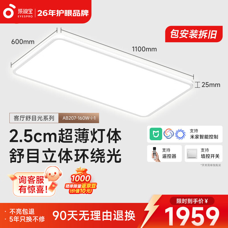 孩视宝舒目光·全光谱护眼吸顶灯2.5cm超薄无缝智能客厅卧室书房led灯具 160W 40㎡内适用 16480lm 【舒目光客厅】暖白-智能款