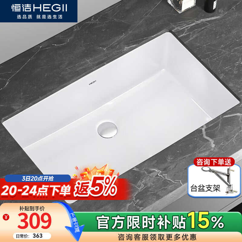 恒洁(HEGII)方形台下盆 家用陶瓷盆卫生间阳台洗脸洗手盆嵌入式面盆台下盆 【S款20寸】方形裸盆