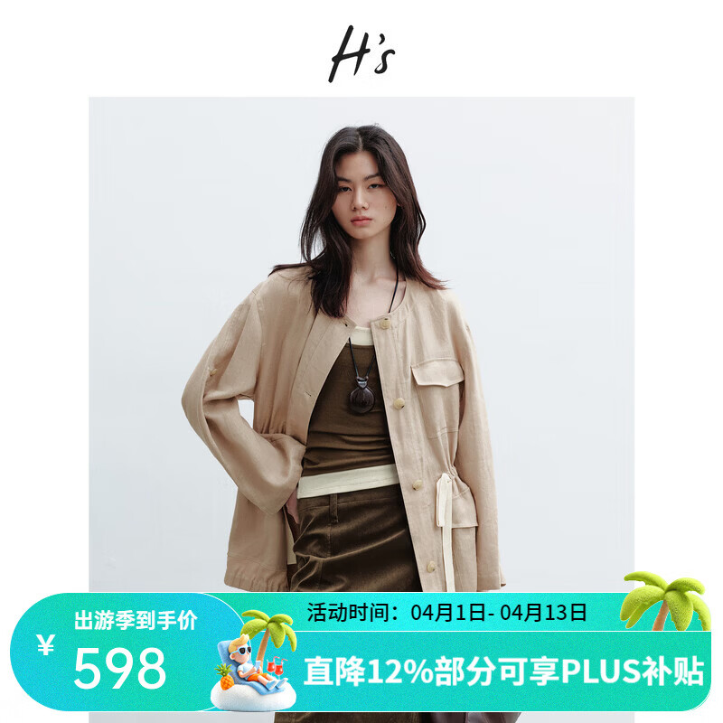 H's亚麻抽绳短外套女26年春季新款设计感圆领廓形抽绳休闲夹克上衣 沙丘色 M