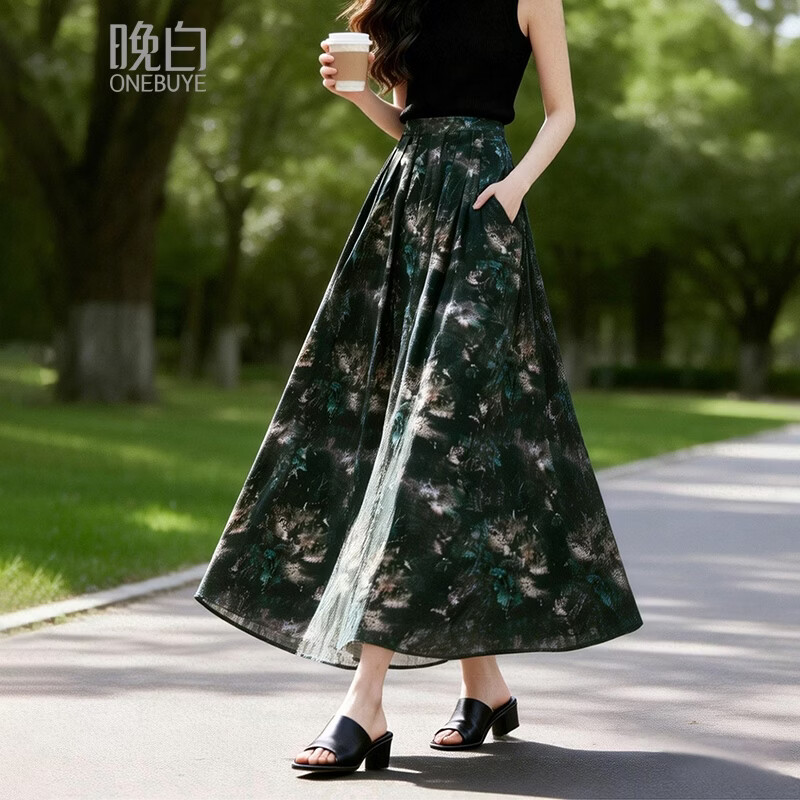 晚白【新品】2026年春款时尚复古文艺风长裙雪纺印花减龄大摆半身裙 花色 S