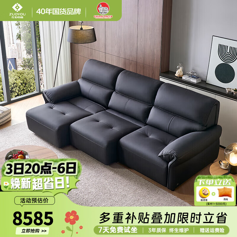 左右大象耳真皮电动沙发床一体两用新款小户型多功能沙发床6081 6零靠墙3.62米四人位双电沙发床 咖