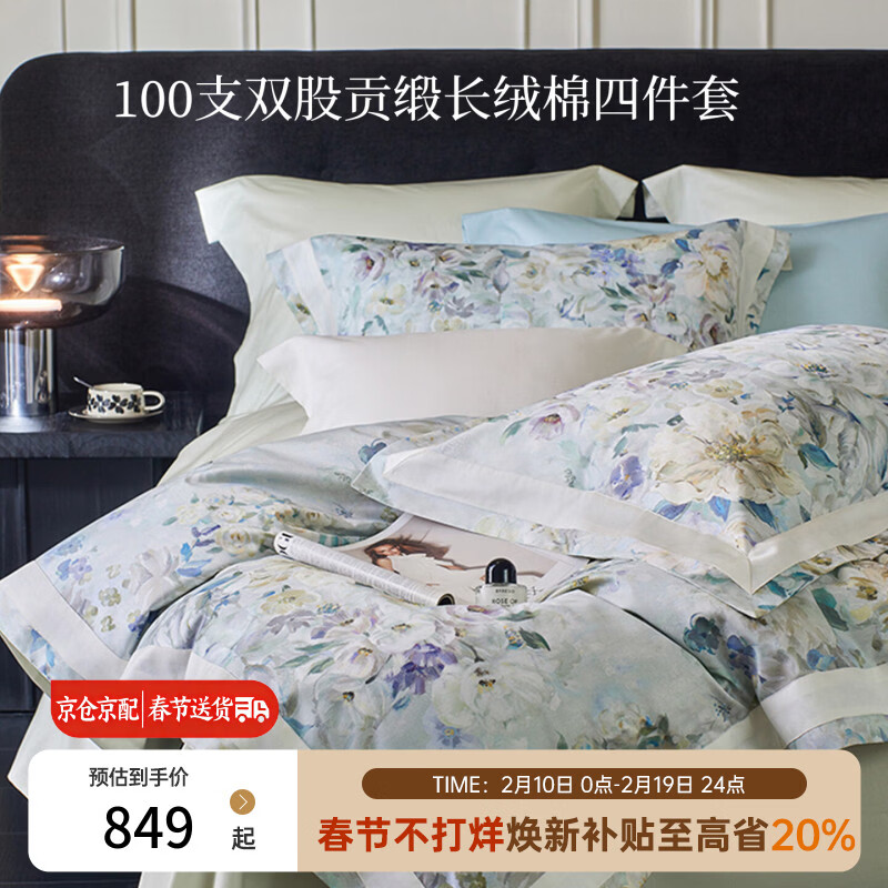 多喜爱家纺纯棉床上四件套 轻奢100支双股贡缎长绒棉全棉被套床单套件1.8米床229*230cm拼边款