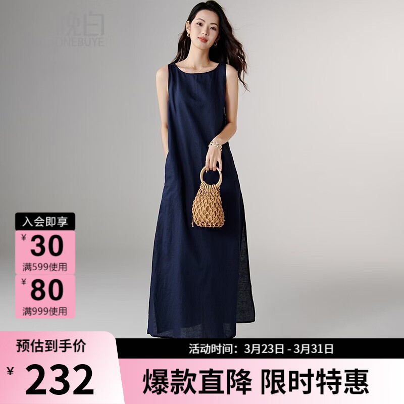 晚白【新品】2026年春款休闲棉麻裙子宽松显瘦纯色无袖连衣裙 蓝色 XL