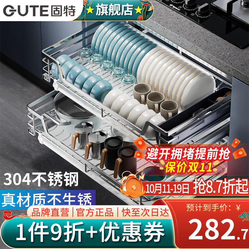 固特(GUTE)厨房拉篮304不锈钢橱柜抽屉式厨房碗柜碗架碗筷置物架调味拉篮 304不锈钢【600柜】扁钢 深度≥430