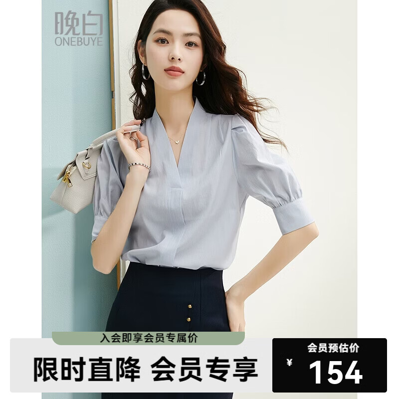 晚白【新品】2026年春款时尚V领上衣宽松舒适日常通勤中袖衬衫女 天空蓝 M