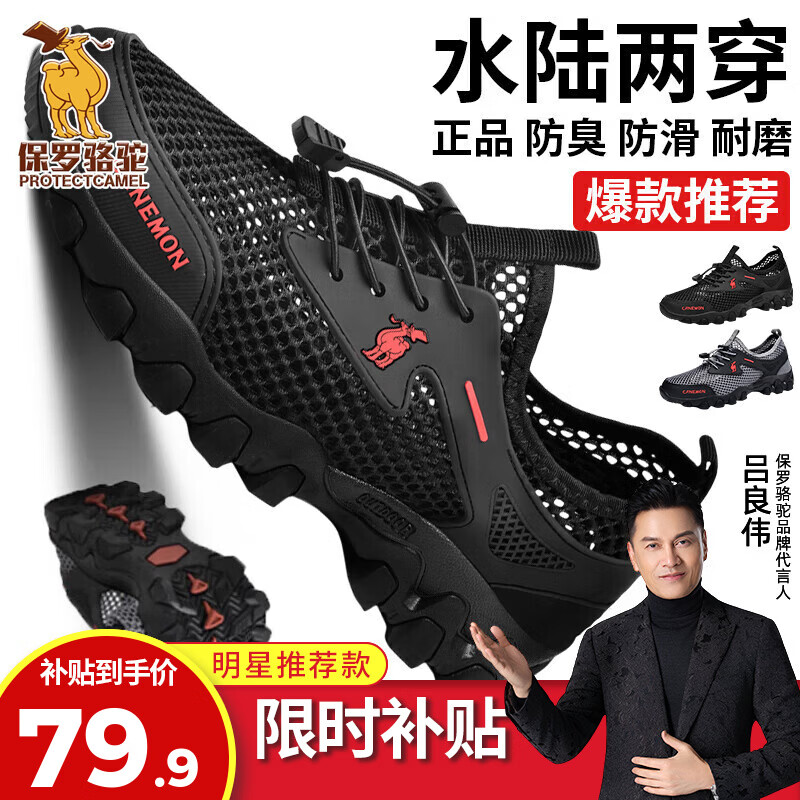 保罗骆驼男鞋 夏季运动户外网面休闲鞋子 耐磨透气溯溪登山鞋 徒步涉水 黑色【透气孔系列2386】 39 标准码脚宽拍大一码,赠运费险