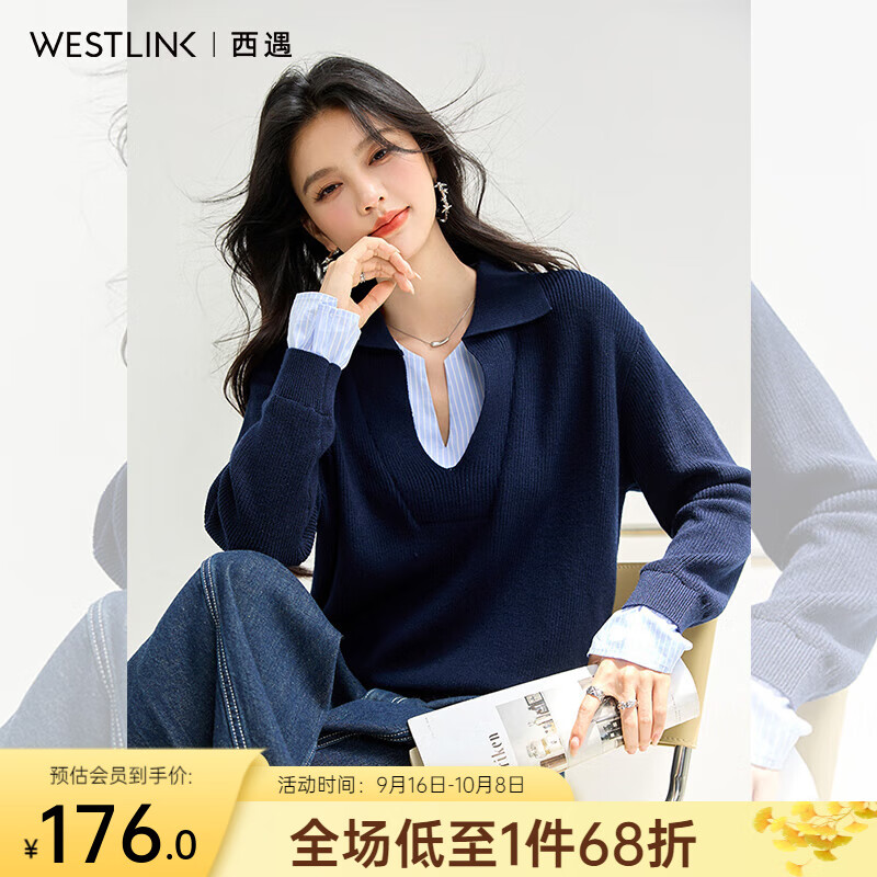 西遇(Westlink)西遇假两件长袖针织衫女2025年秋季新款翻领条纹拼接蓝色套头毛衣 蓝色 (预售15天) M (160)