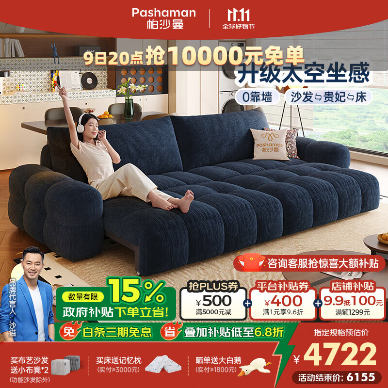 帕沙曼电动沙发床布艺小户型客厅复古风棉花糖可伸缩折叠功能沙发2713ZF 【智能三控款】3.07米多人位·单功能位 【旗舰版】抗菌防水雪尼尔TY74 (硅胶棉+竹炭海绵)
